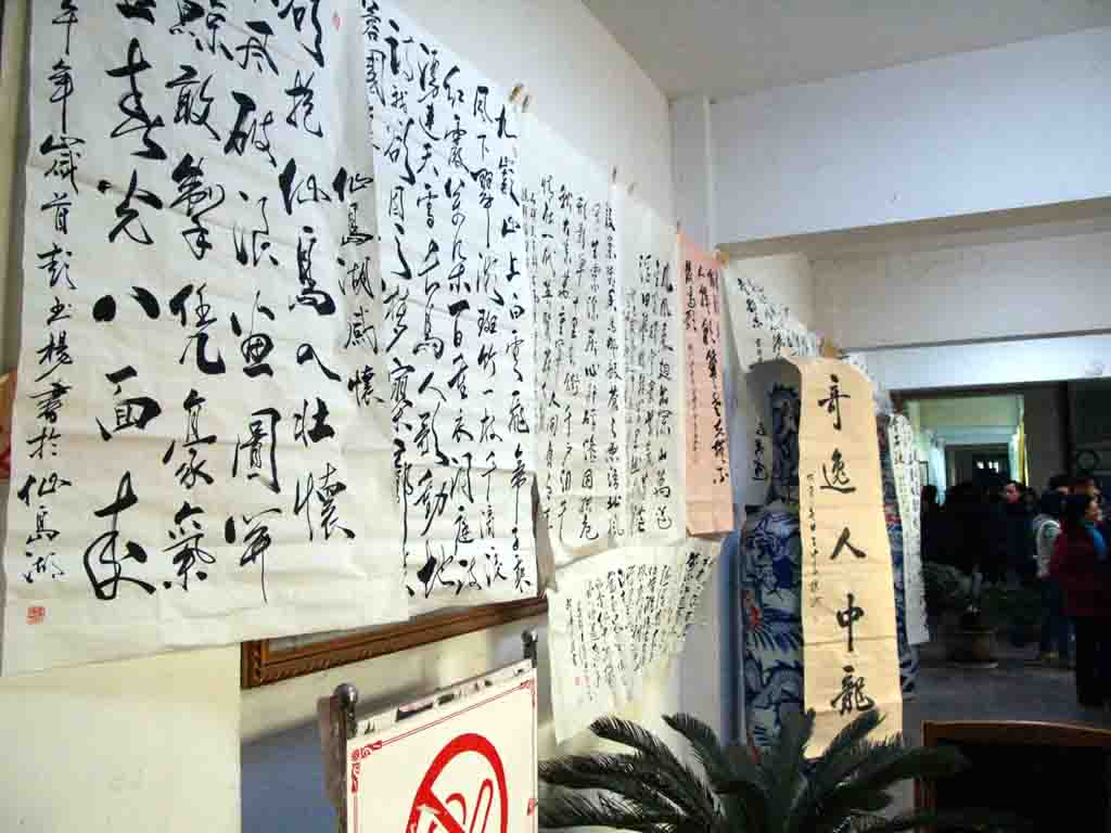 天气很冷,刚下过两天雨的腊月阴沉沉的。根据安排,诗会开始时间是上午9:30,可一大早,兴致勃勃的诗社会员就陆陆续续的来到了学校。有的满头银霜,有的步履蹒跚,可岁月的刻刀和漫天的阴沉丝毫阻挡不了他们内心的活力在脸上的绽放。有的老友相逢,紧握住对方的手说着笑着;有的手拿着诗稿边摇着头边朗诵着;有的在忙碌的张挂着自己或是他人的书法作品。不一会儿功夫,一楼大厅已是诗的世界、书法的世界,很多学生、老师在这里驻足品味。